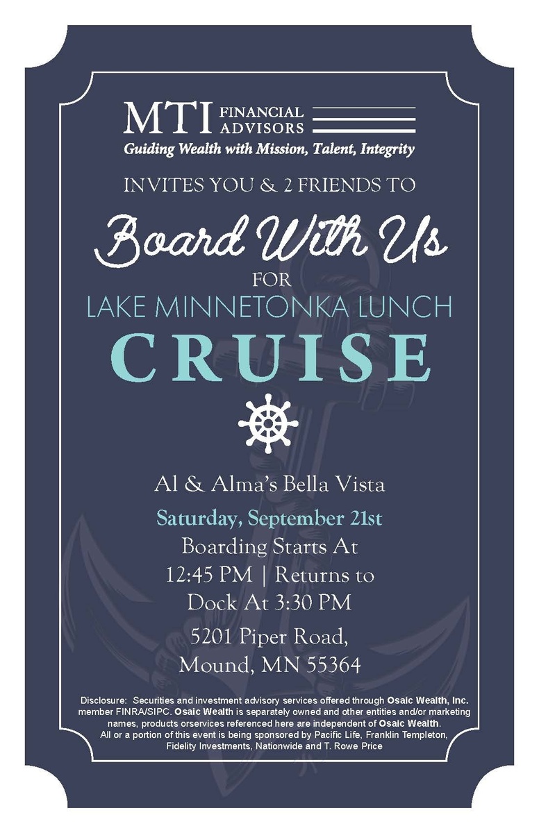 Please join us for the perfect fusion of spectacular scenery and attentive award-winning service aboard Al and Alma’s magnificent Bella Vista. Enjoy a 360 degree view of Lake Minnetonka’s incredible shoreline, islands, and homes. An assortment of appetizers, desserts and beverages will be served.